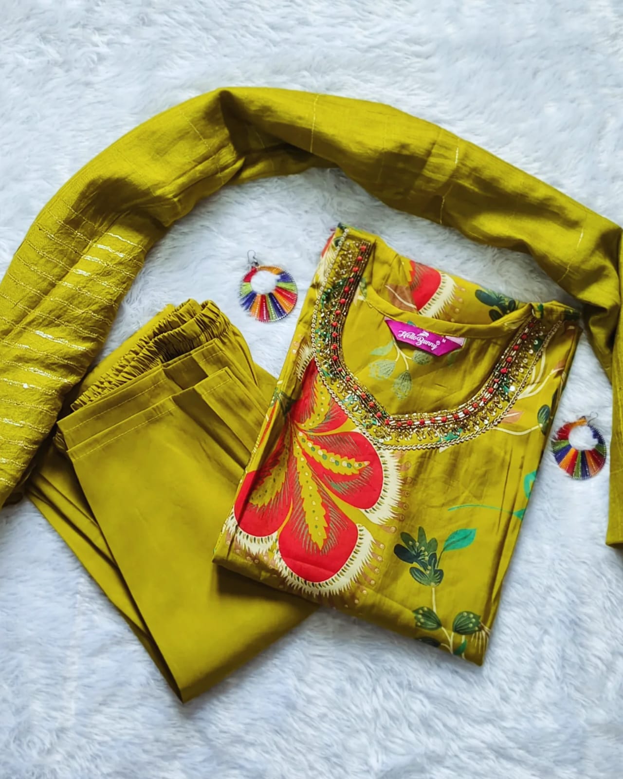Step into effortless elegance with this Green Silk Blend 3 piece suit set for women. Designed with a stylish V neck and delicate embroidery work, this ensemble includes a matching dupatta and comfortable bottoms. Perfect for festive occasions, family gatherings or parties, the soft silk blend fabric drapes beautifully while adding a hint of luxury to your look. Update your ethnic wardrobe with this timeless embroidered suit set from FashionKey.