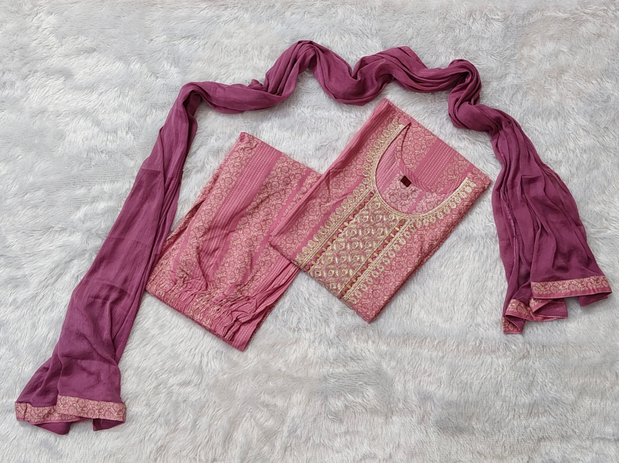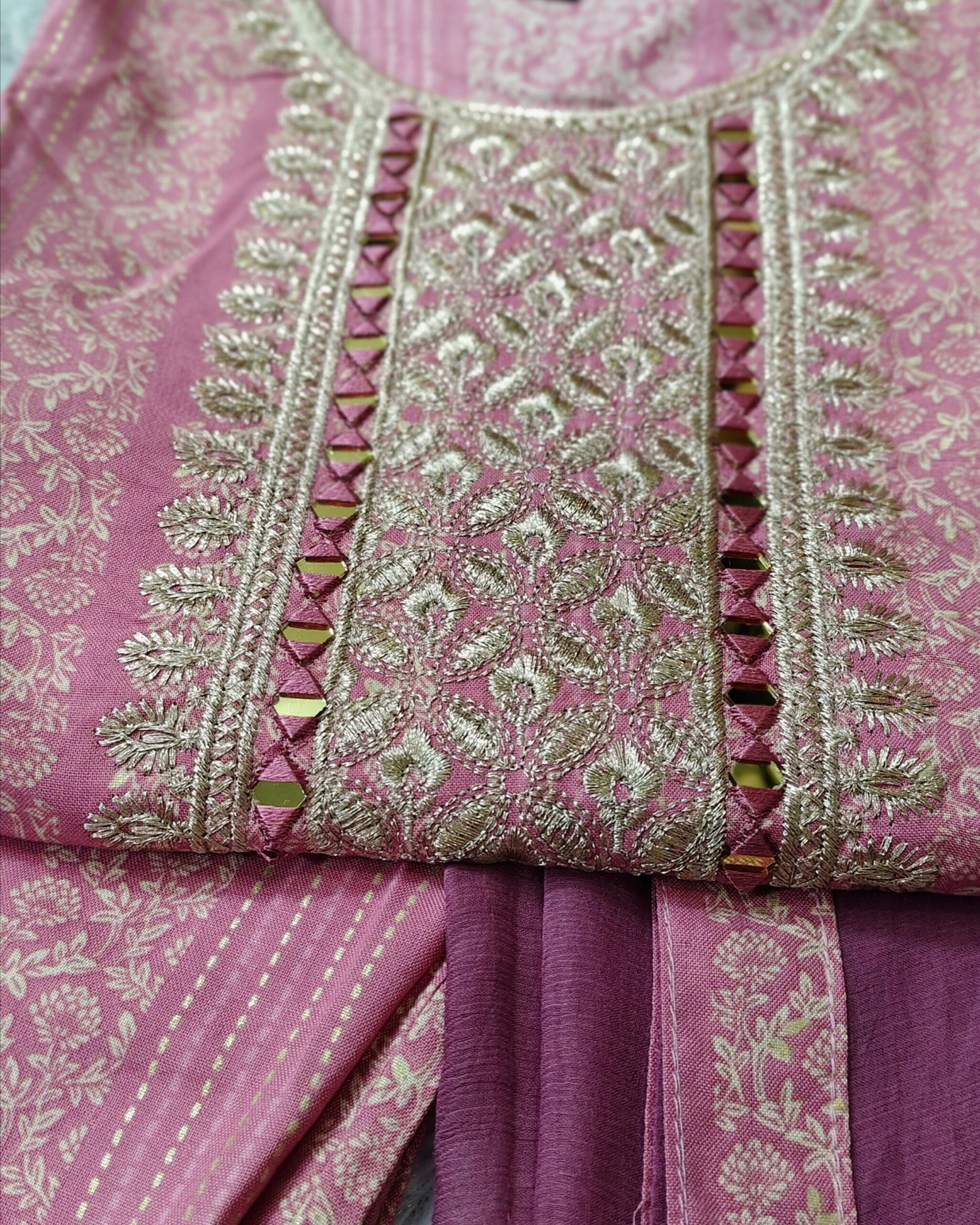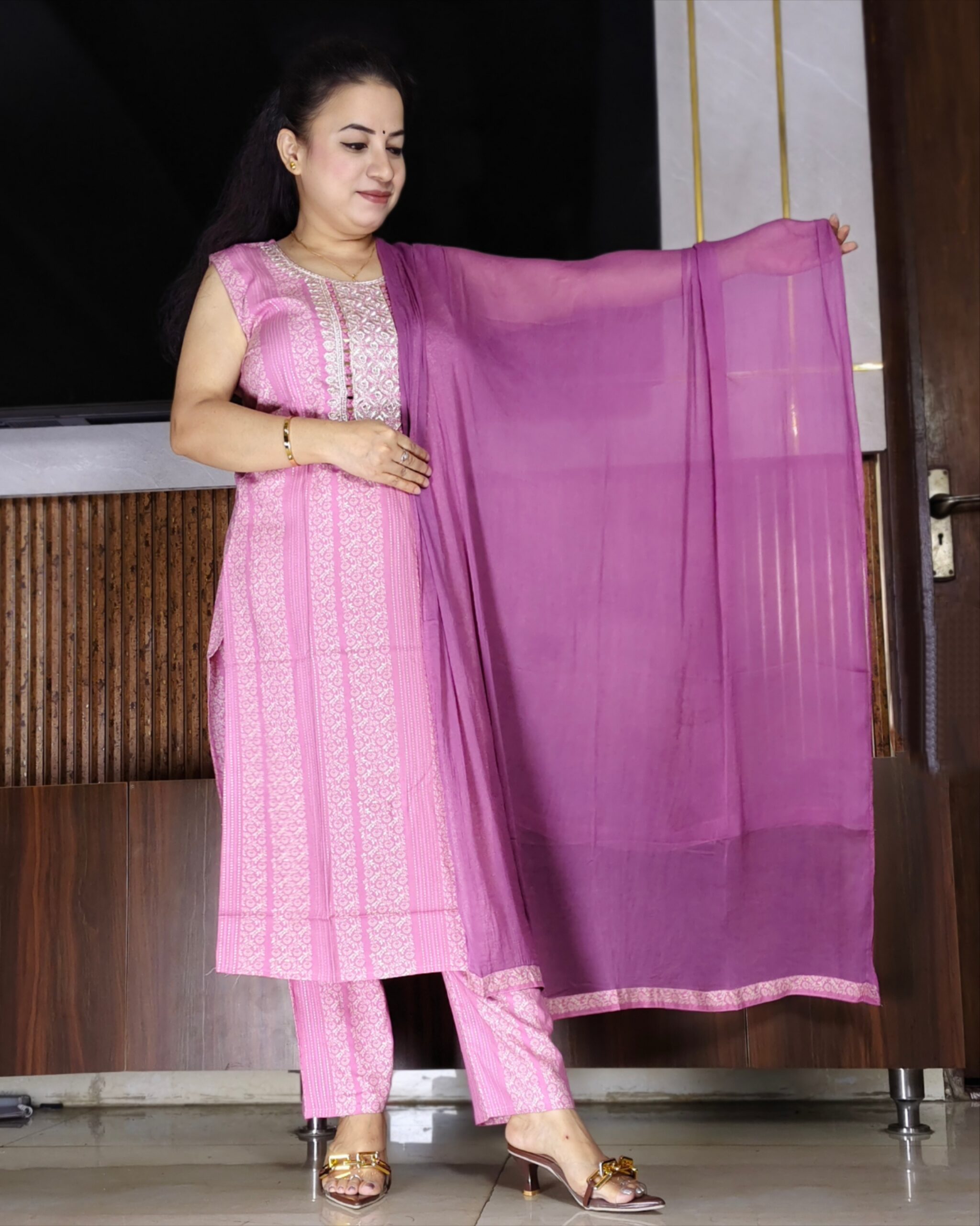 Refresh your ethnic collection with this elegant pink rayon cotton suit set. Designed for both comfort and grace, this ensemble features a beautifully printed kurta with embroidered detailing on the neckline, paired with straight-fit pants and a soft chiffon dupatta. Crafted from breathable rayon cotton, it ensures all-day ease while keeping your look stylish and festive.