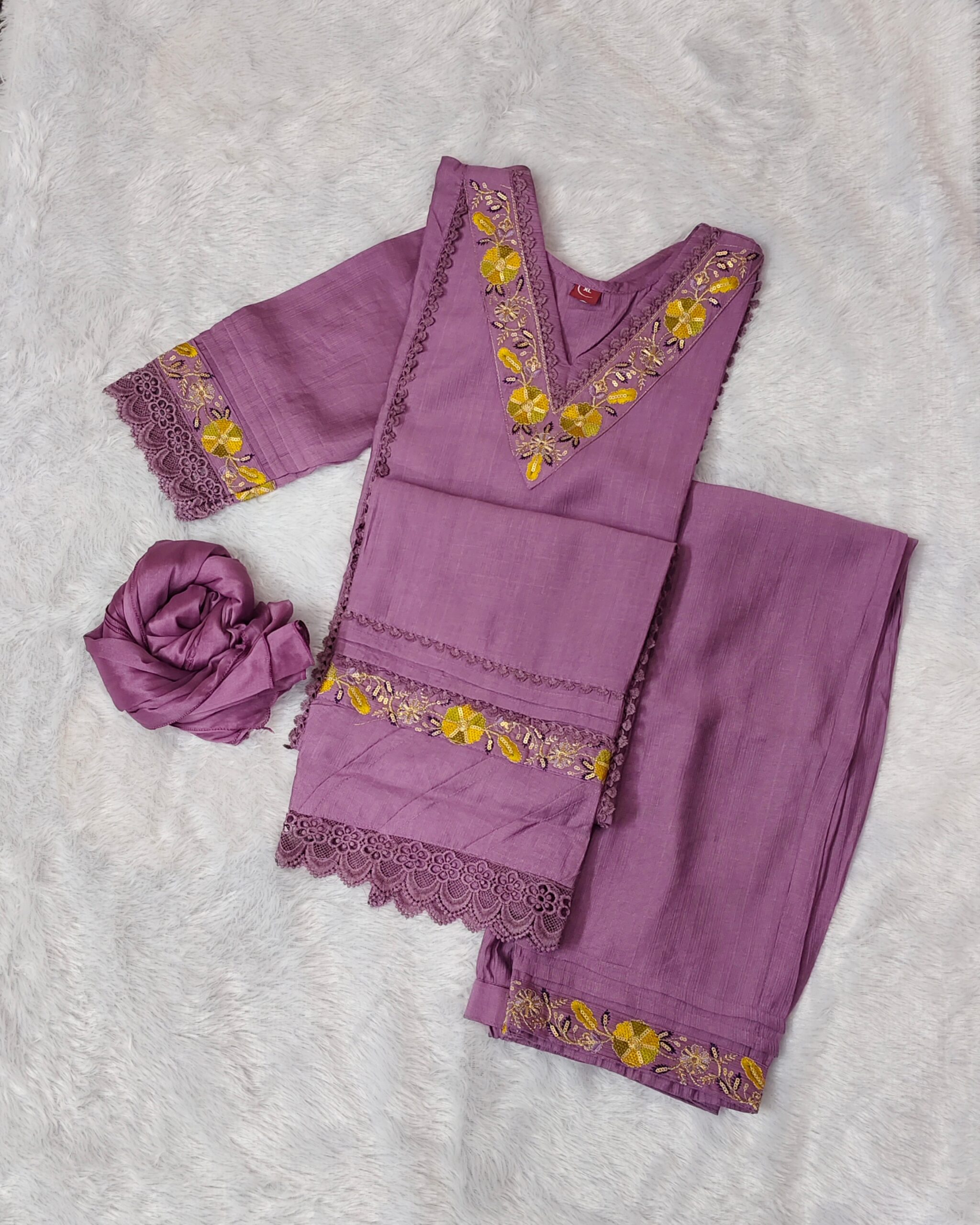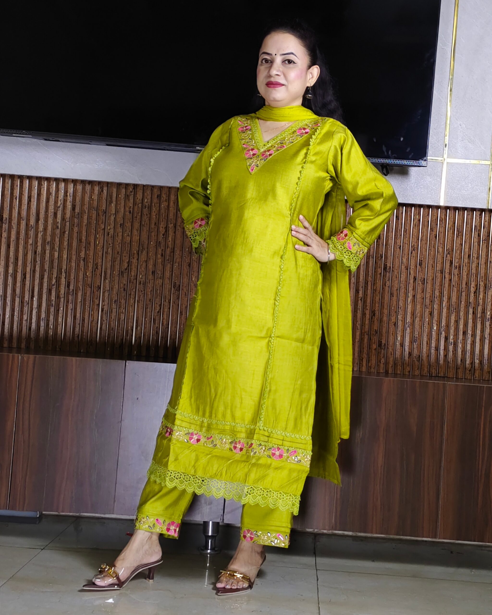 Premium Vatican cotton suit with yellow floral embroidery and lace detailing. Elegant, breathable, and perfect for festive & office wear.