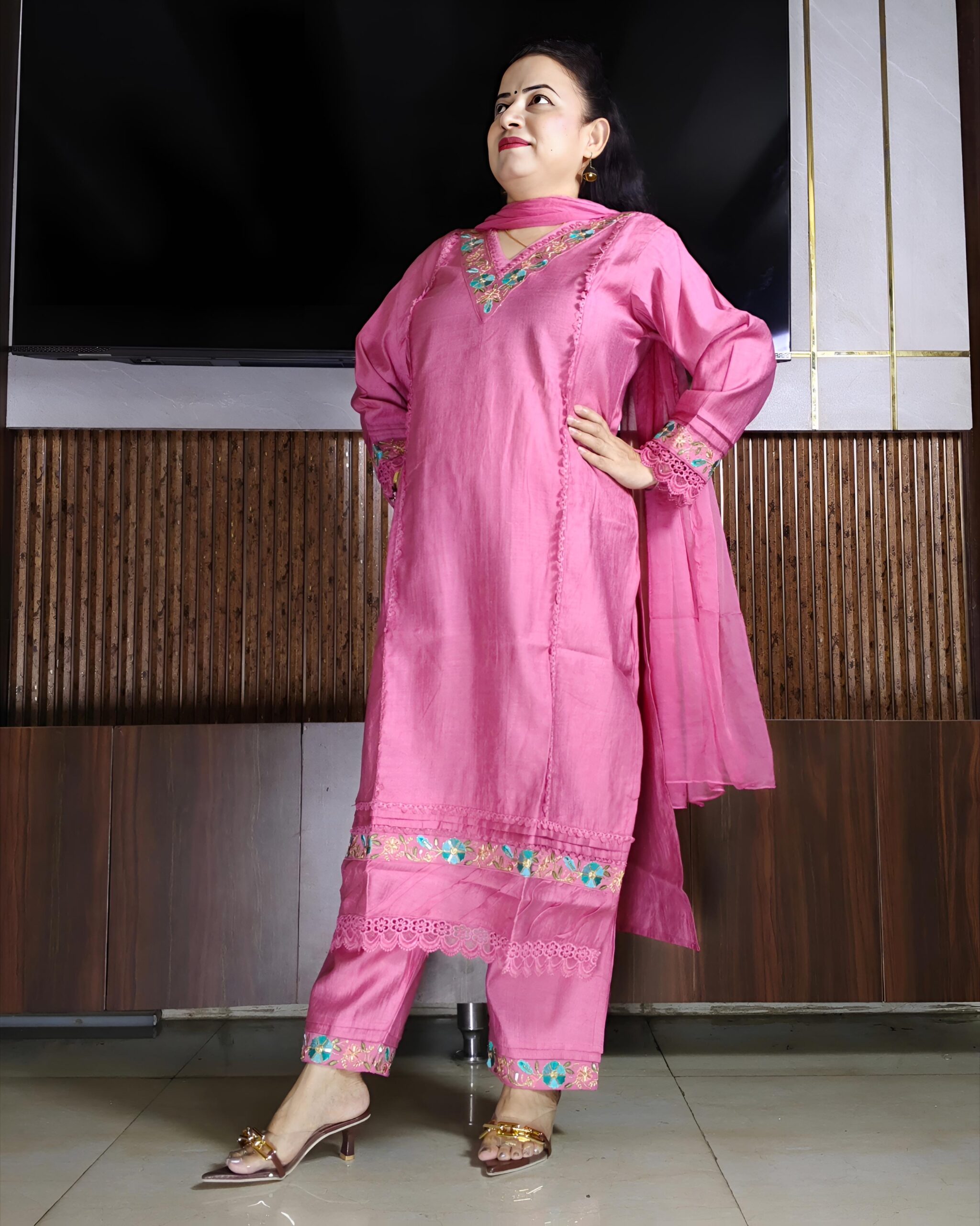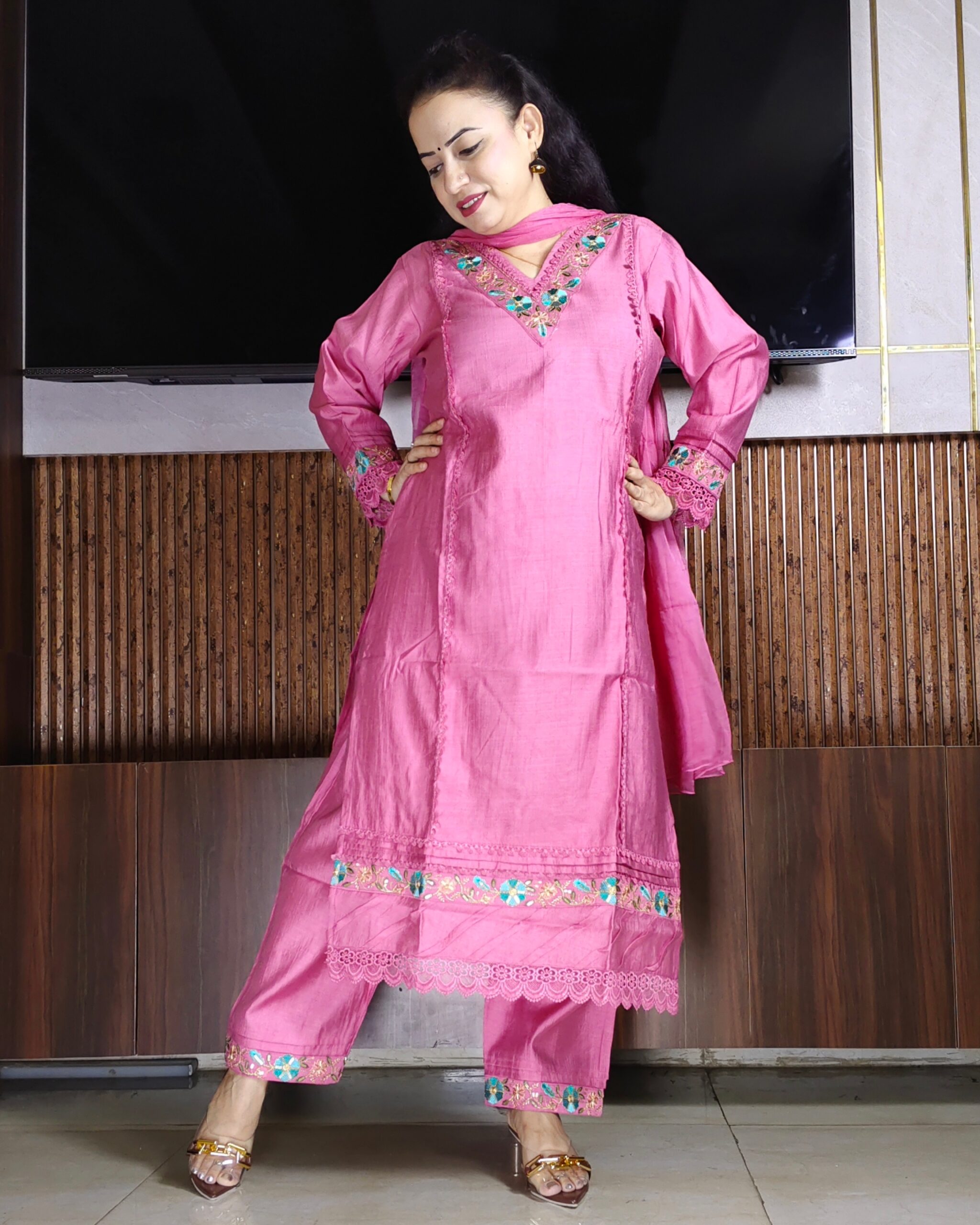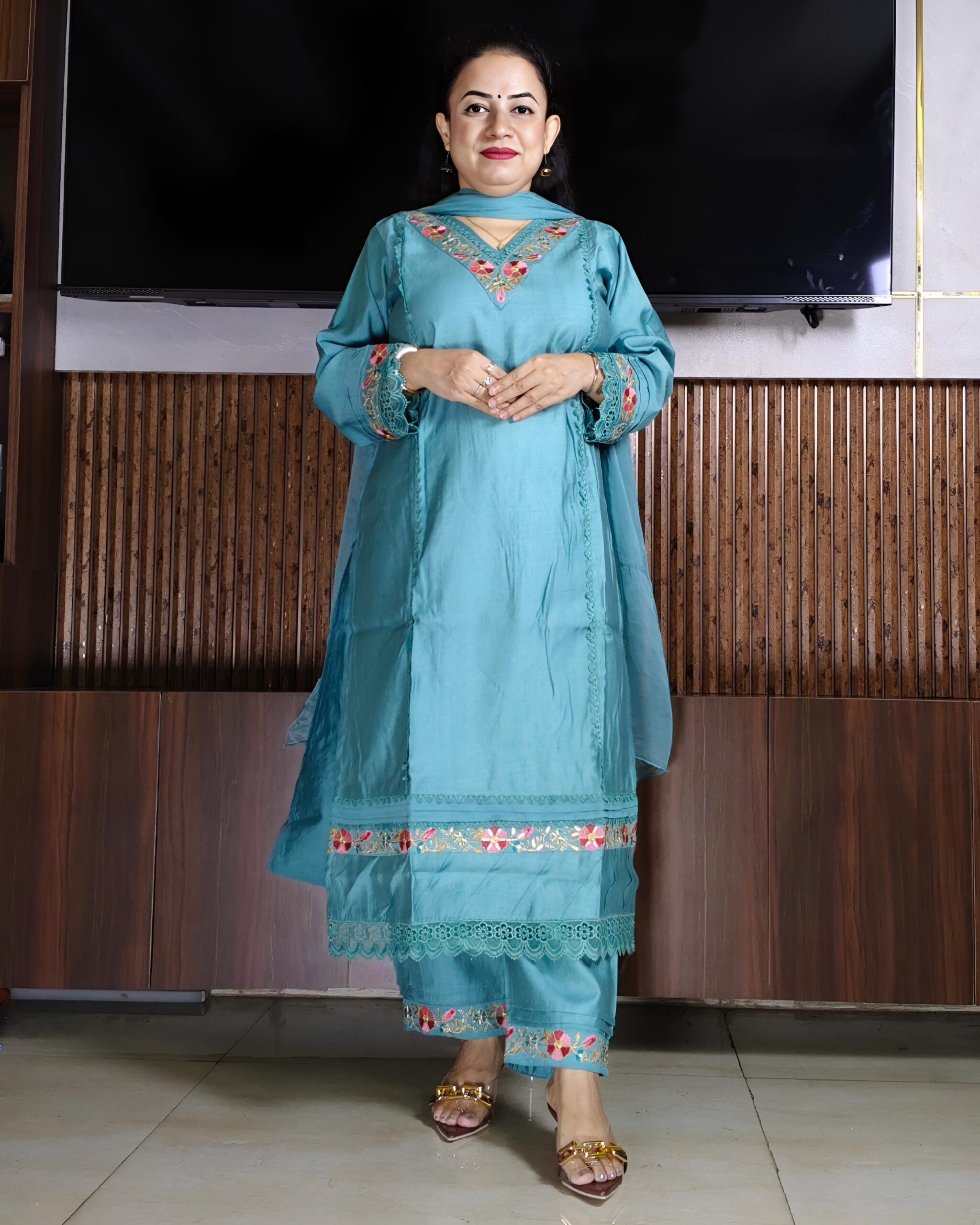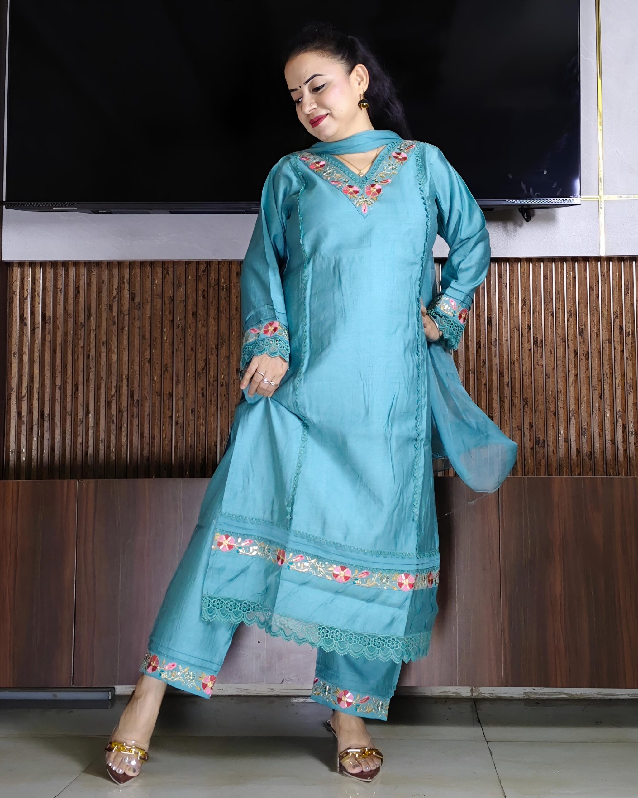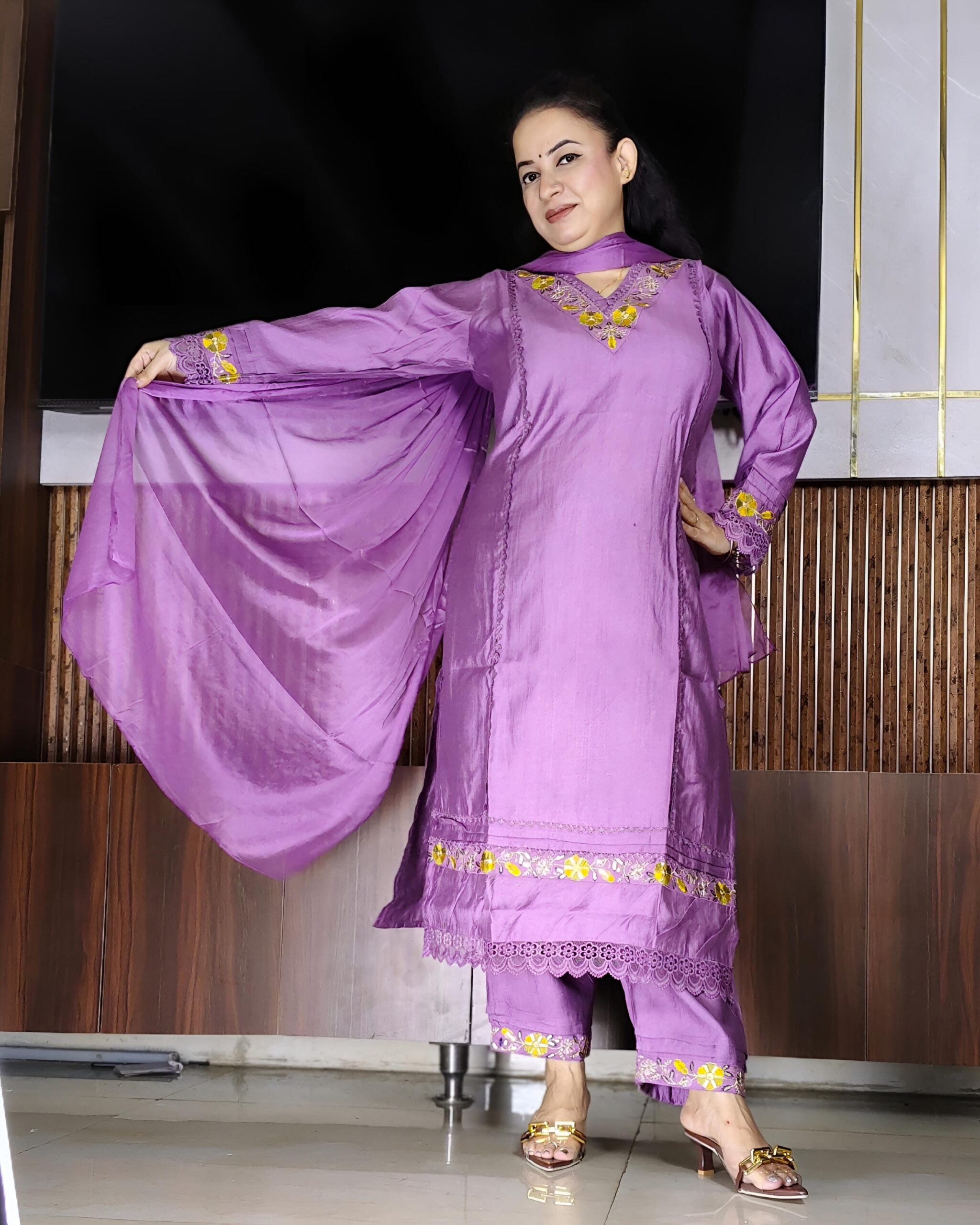 Premium Vatican Cotton Suit with Floral Embroidery (Available in 4 Colors) | Free Size M(40) – XL(42) (Purple, Green, Pink, Teal Blue)