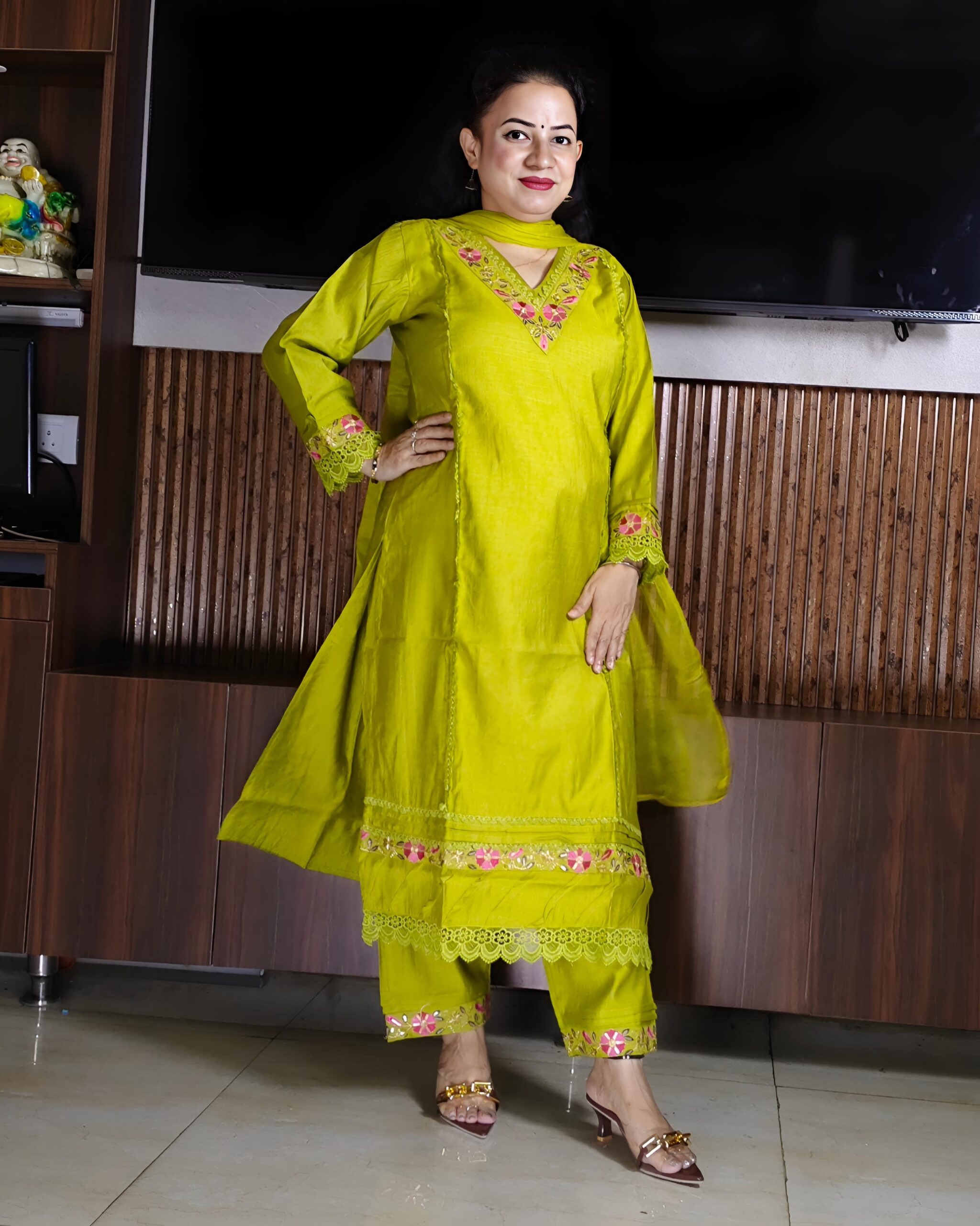 Elevate your ethnic collection with this Premium Vatican Cotton Suit Set, crafted for unmatched elegance and comfort. The soft yet durable Vatican cotton fabric ensures all-day wearability, while the intricate yellow floral embroidery and lace detailing bring festive charm. This versatile outfit transitions effortlessly from celebrations to office wear.