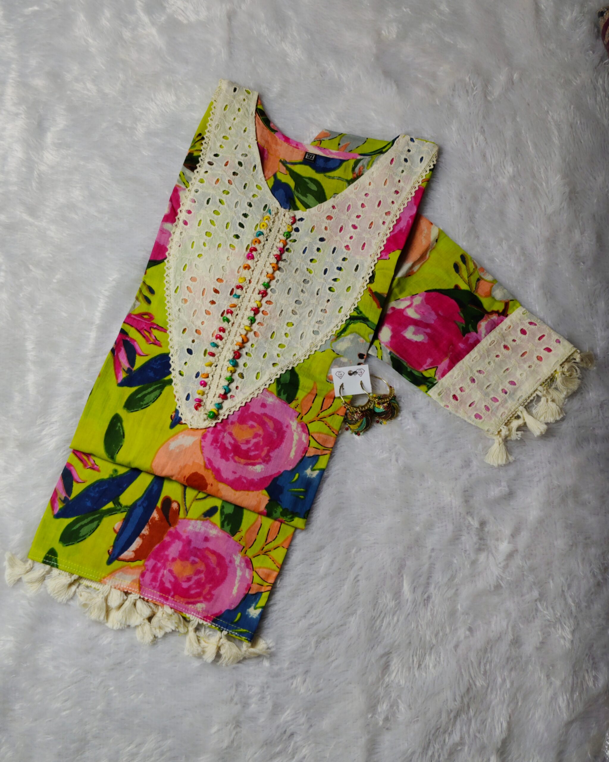 Elevate your festive wardrobe with this vibrant Yellow Floral Printed Suit Set, crafted to exude freshness, charm, and effortless elegance. The straight-cut kurta showcases bold multicolor floral prints highlighted with intricate lace detailing on the neckline, cuffs, and hemline. Paired with solid yellow straight pants featuring lace borders and a matching chiffon dupatta, this ensemble offers breezy comfort and contemporary ethnic appeal. Made from breathable Mal Cotton fabric, it is perfect for festive gatherings, summer celebrations, and casual ethnic outings.