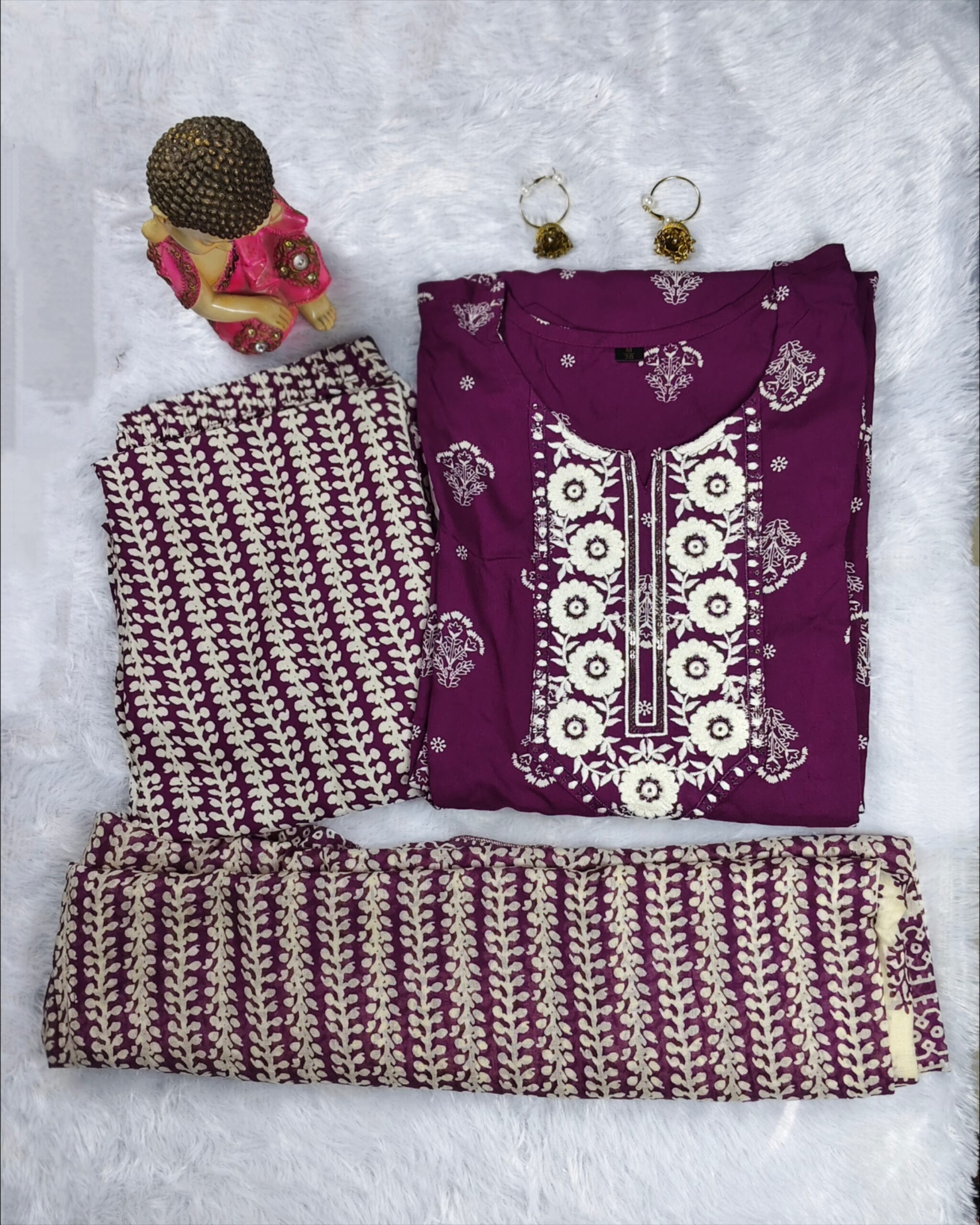 Enhance your everyday ethnic wardrobe with this elegant wine rayon cotton suit set. Designed for comfort and style, this outfit features a beautifully embroidered neckline on a deep wine kurta with traditional floral prints. It is paired with a cream-colored dupatta and bottoms, both featuring fine block prints for a coordinated and graceful look. This ensemble is ideal for daywear, office, and casual outings, offering both elegance and breathability.