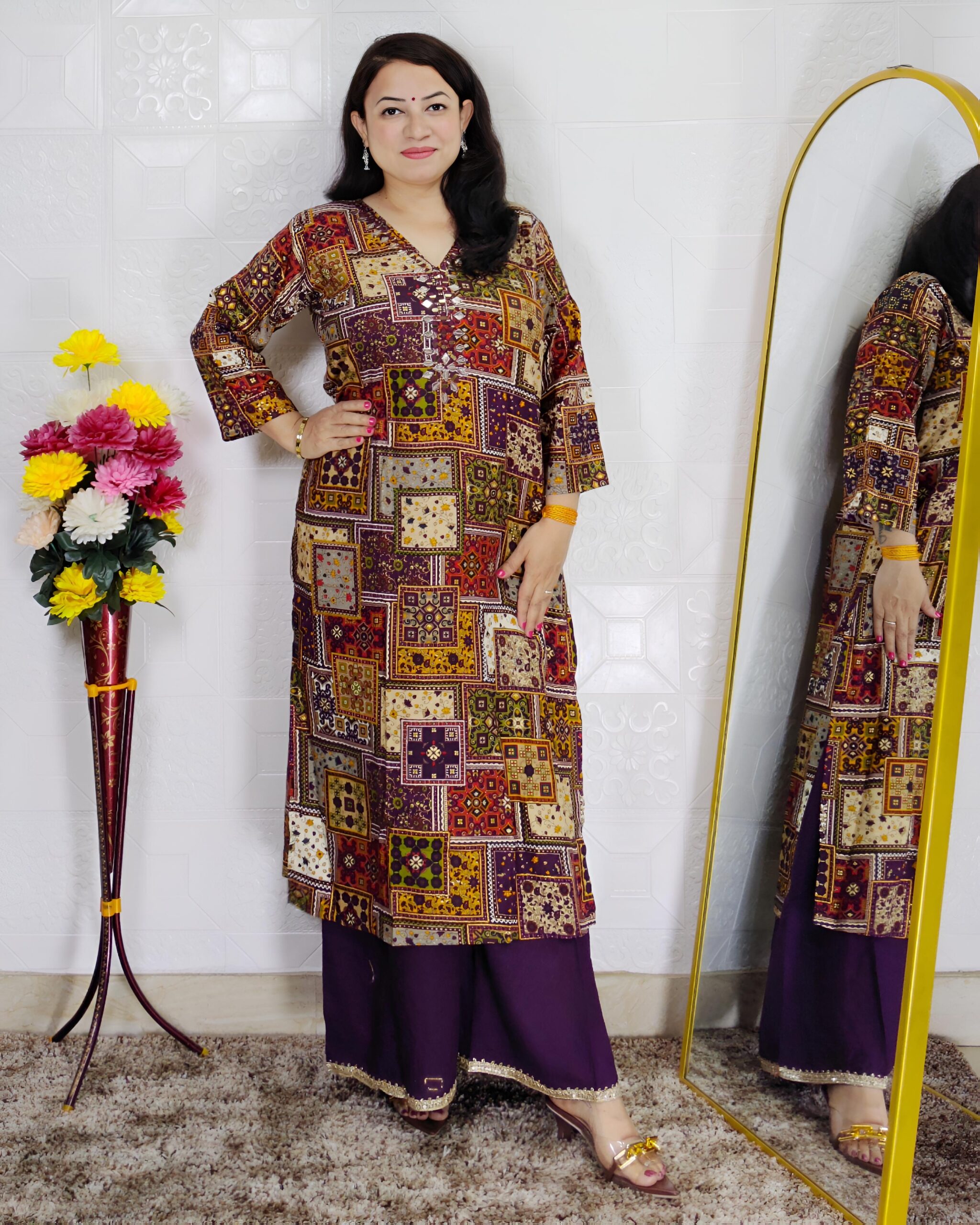 Upgrade your everyday ethnic style with this elegant Wine Patchwork Printed 2 Piece Suit Set crafted from premium rayon cotton fabric. The kurta features a unique multicolor patchwork print combining geometric and traditional motifs, creating a vibrant and eye-catching design.