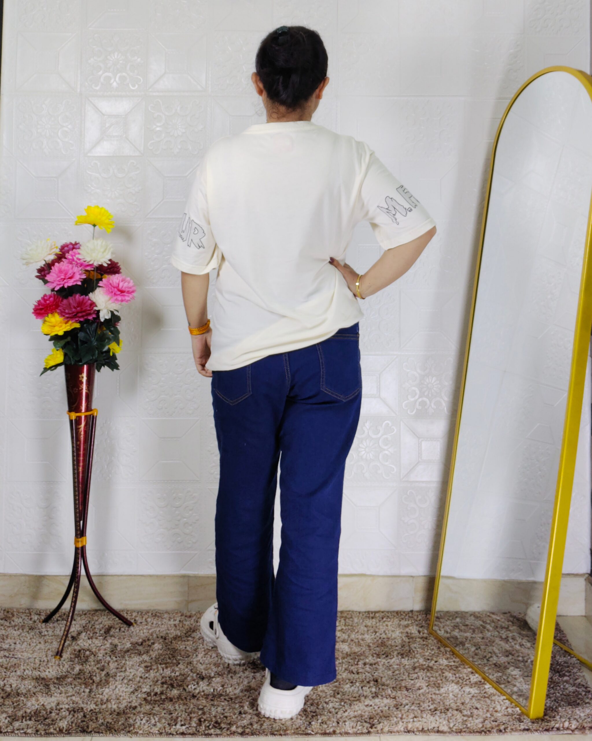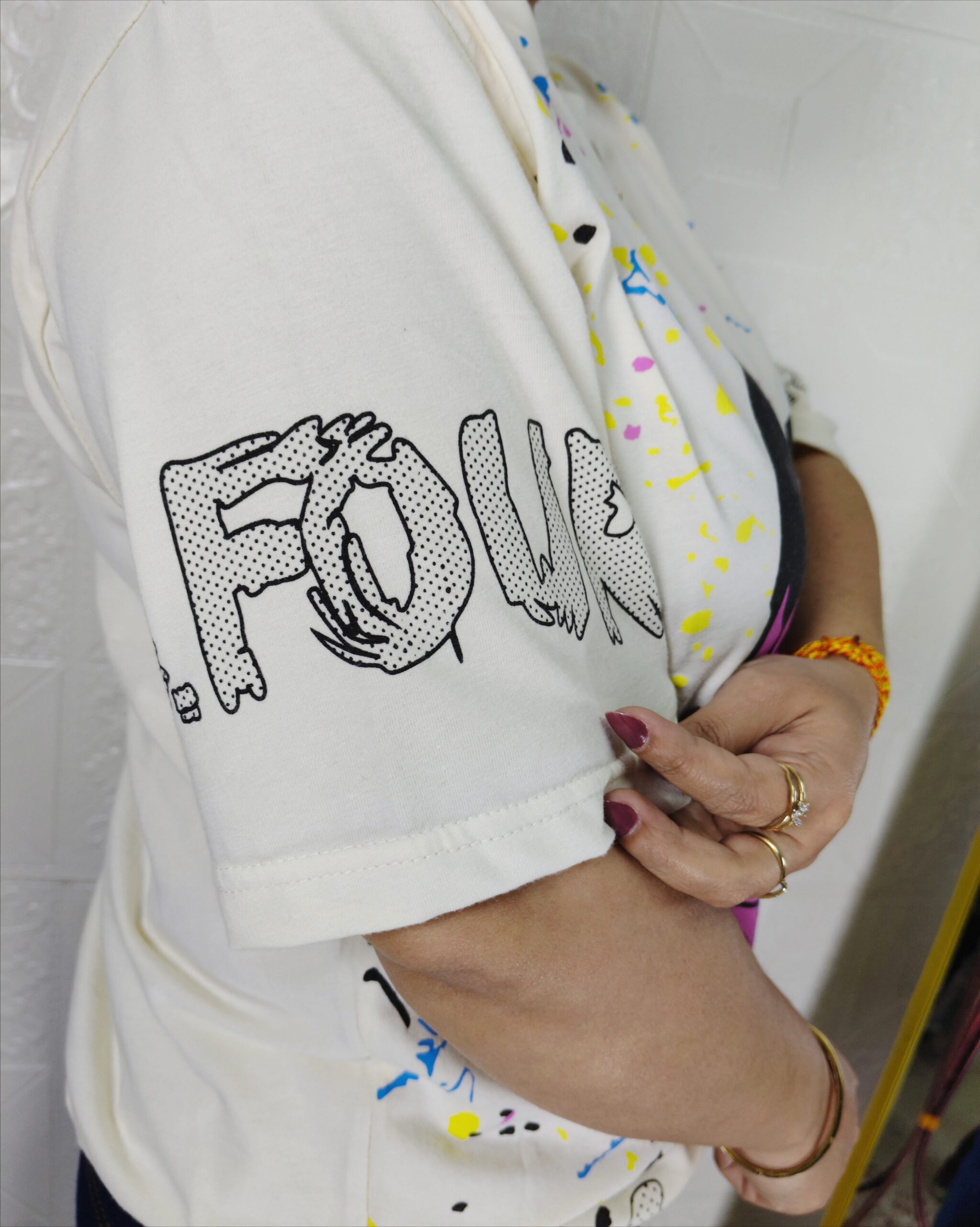 Women Printed Lycra T-Shirt – Stretchable Casual Top (Off White Color), Free Size M(38) – XL(42)